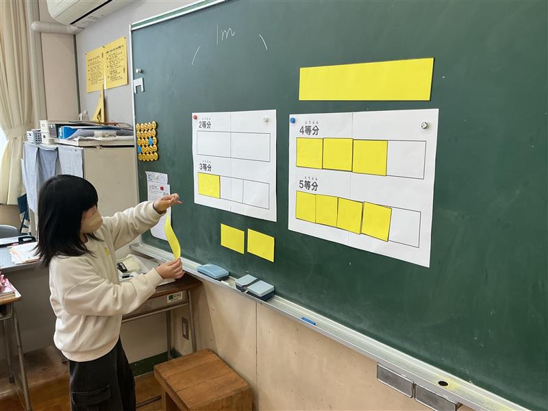 3年生は分数の勉強に取り組んでいます。操作活動を通して,視覚的に分数の量感をつかめるようにクラス全員で取り組んでいます。